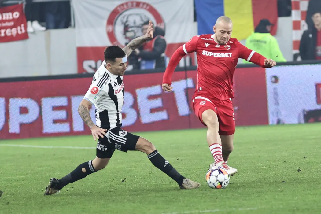 Patrick Haakon Olsen si Ovidiu Alexandru Bic in meciul de fotbal dintre Dinamo Bucuresti si Universitatea Cluj, contand pentru SuperLiga Superbet, desfasurat pe Stadionul Arcul de Triumf din Bucuresti, vineri 24 ianuarie 2025. © FOTO: Gheorghe Fluster/SPORT PICTURES