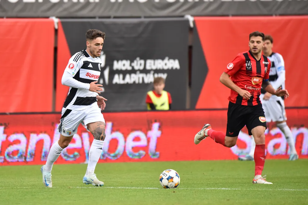 Andrej Fabry si Szilárd Veres in meciul de fotbal dintre FK Csikszereda Miercurea Ciuc si FC Universitatea Cluj, contand pentru Superliga Superbet, desfasurat pe Stadionul Municipal din Miercurea Ciuc, sambata 4 octombrie 2025. © FOTO:Zoltan Pal/SPORT PICTURES