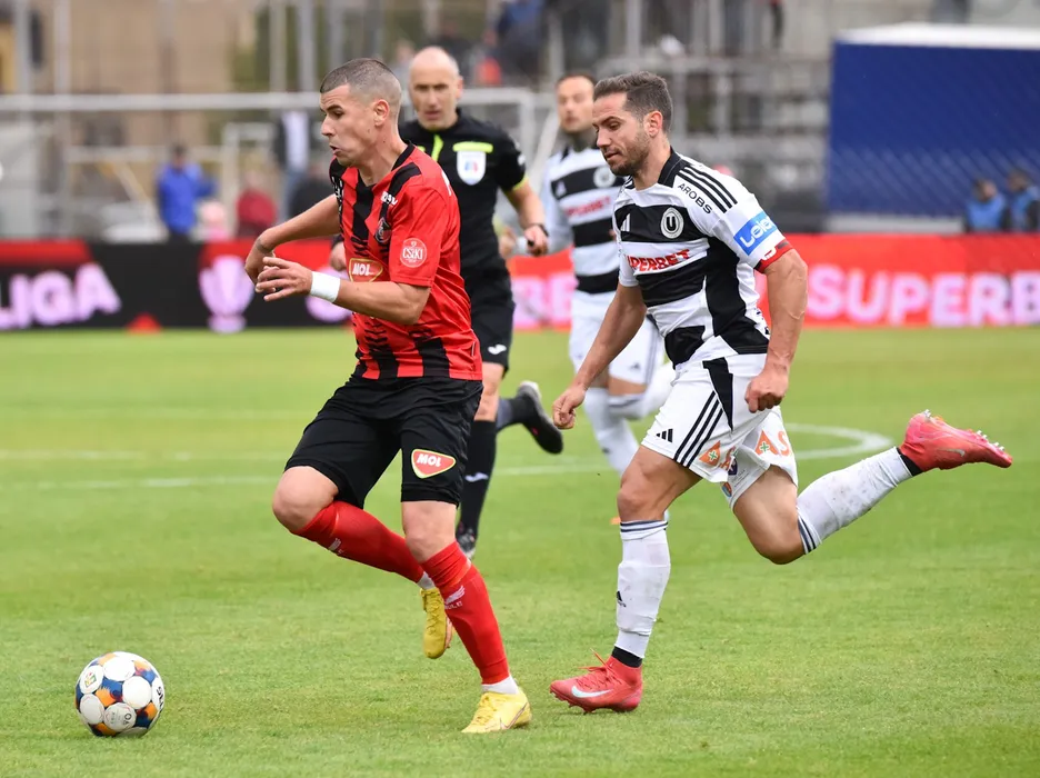 János Ferenczi si Mihaita Alexandru Chipciu in meciul de fotbal dintre FK Csikszereda Miercurea Ciuc si FC Universitatea Cluj, contand pentru Superliga Superbet, desfasurat pe Stadionul Municipal din Miercurea Ciuc, sambata 4 octombrie 2025. © FOTO:Zoltan Pal/SPORT PICTURES
