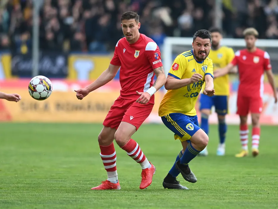 Guilherme Gomes Garutti si Constantin Valentin Budescu in meciul de fotbal dintre Petrolul Ploiesti si CS Mioveni, contand pentru Play-out-ul Superligii Superbet, desfasurat pe Stadionul Ilie Oana din Ploiesti, luni 10 aprilie 2023. © FOTO:Razvan Pasarica/SPORT PICTURES