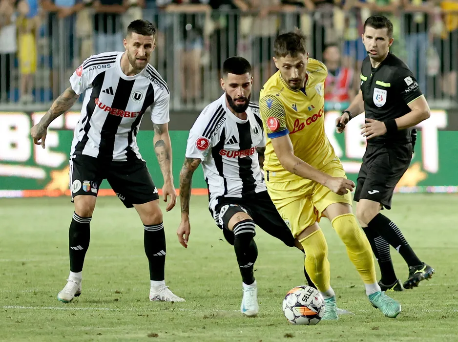 Gheorghe Teodor Grozav, Arbitrul central Bogdan Dumitrache și Radu Ștefaniță Boboc, Ovidiu Marian Popescu în meciul de fotbal dintre FC Petrolul Ploiești și FC Universitatea Cluj, contând pentru Superliga Superbet, desfășurat pe Stadionul Ilie Oană din Ploiești, luni 12 august 2024. © FOTO: Gică FLUȘTER/SPORT PICTURES