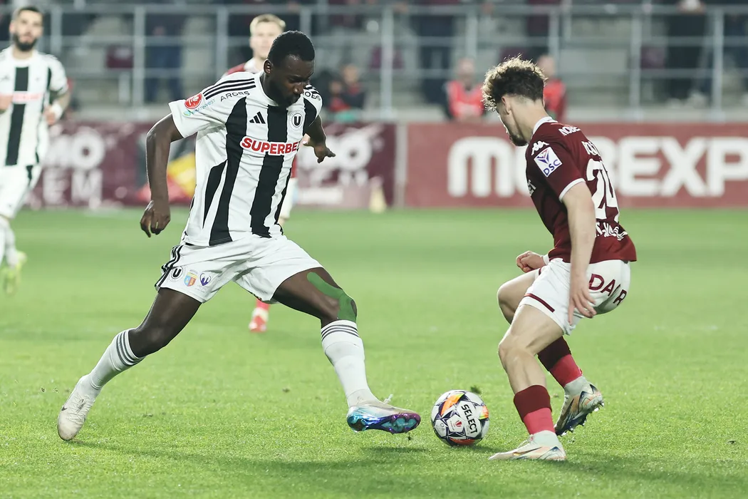 Issouf Macalou (S), de la Universitatea Cluj, lupta pentru balon cu Andrei Borza (D), de la Rapid, in timpul meciului de fotbal din etapa 5 a play-off-ului Superligii, disputat pe stadionul Rapid-Giulesti din Bucuresti, sambata, 19 aprilie 2025. GEORGE FLUSTER / MEDIAFAX FOTO