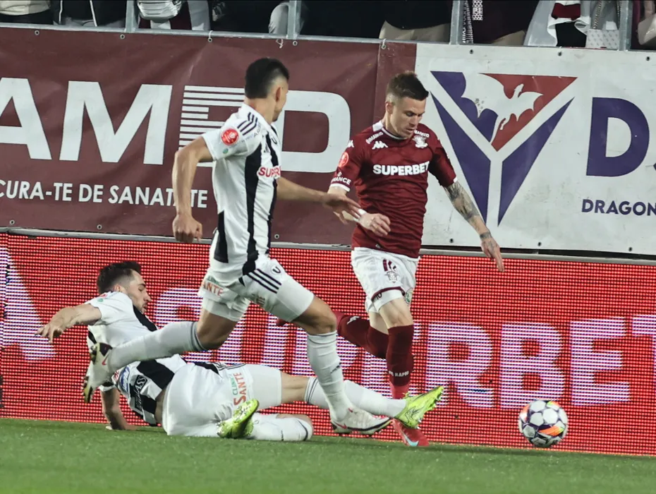 Claudiu Adrian Mihai Petrila si Lucian Iulian Cristea, Dorin Marian Codrea in meciul de fotbal dintre FC Rapid 1923 Bucuresti si FC Universitatea Cluj, din cadrul Superligii Superbet - Play-Off, desfasurat pe Superbet Arena-Giulesti din Bucuresti, sambata 19 aprilie 2025. © FOTO: Gheorghe Fluster/SPORT PICTURES