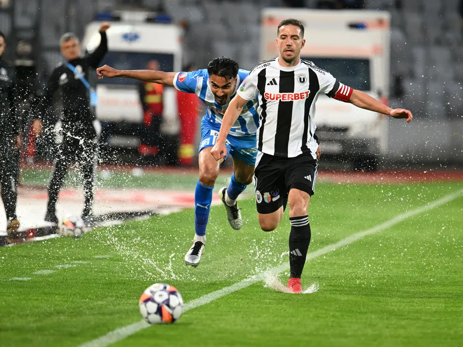 Ștefan Baiaram si Mihaita Alexandru Chipciu în meciul de fotbal dintre Universitatea Cluj si Universitatea Craiova, contând pentru Play off-ul Superligii Superbet, desfășurat pe Cluj Arena din Cluj Napoca, sambata 26 aprilie 2025. © FOTO:Răzvan Pasarica/SPORT PICTURES