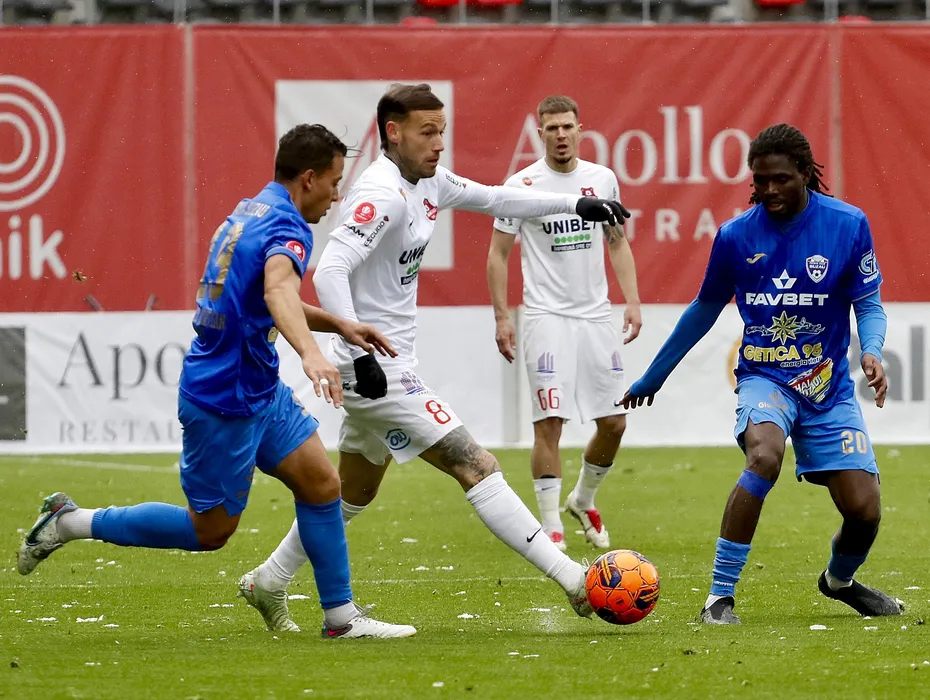 Alesssandro Murgia si Alessandro Ciranni, Tavares David Jose Gomes Oliveira in meciul de fotbal dintre AFC Hermannstadt Sibiu si Gloria Buzau, contand petru Superliga Superbet - Play-Out, desfasurat pe Stadionul Municipal din Sibiu, duminica 6 aprilie 2025. © FOTO: Valentin Macrea/SPORT PICTURES