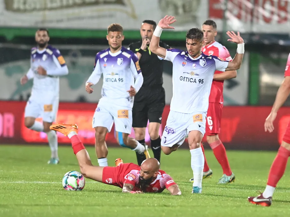 Gabriel Rodrigues De Moura la pamant alaturi de Andrias Cristian Calcan in meciul de fotbal dintre FC Arges si Dinamo Bucuresti, contand pentru mansa retur a Barajului pentru mentinerea in Superliga Superbet, desfasurat pe Stadionul Orasenesc din Mioveni, sambata 3 iunie 2023. © FOTO:Razvan Pasarica/SPORT PICTURES
