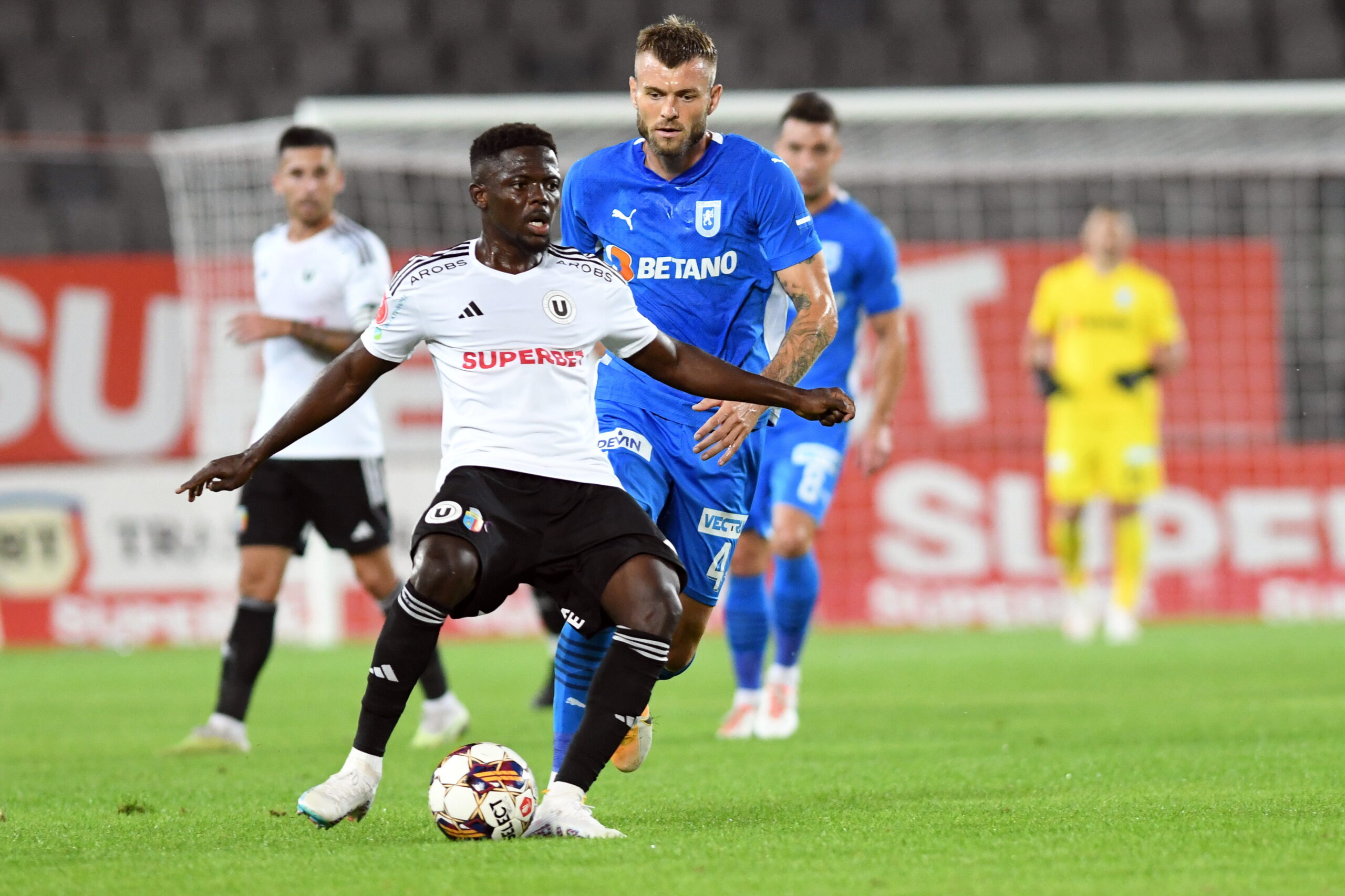 Meciul de fotbal dintre Universitatea Cluj (echipament alb/negru) si CS Universitatea Craiova (echipament albastru) din etapa a X-a a Superligii, disputat pe Arena Cluj din Cluj-Napoca, sambata, 23 septembrie 2023. In imagine: Marian Danciu (S) si Bogdan Vatajelu (D). FLAVIU BUBOI / MEDIAFAX FOTO