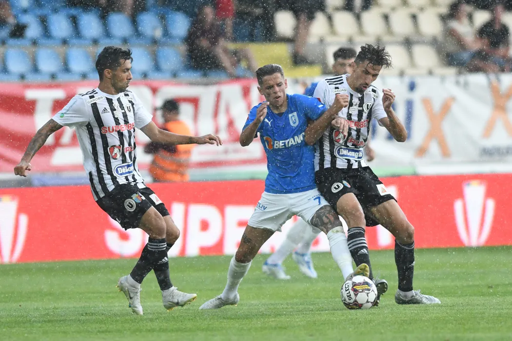 George Campanu (C), de la CS Universitatea Craiova, lupta pentru balon cu Ioan Filip (D), de la U Cluj, in meciul de fotbal din etapa a II-a a Superligii, disputat pe stadionul Gaz Metan din Medias, duminica, 24 iulie 2022. FLAVIU BUBOI / MEDIAFAX FOTO