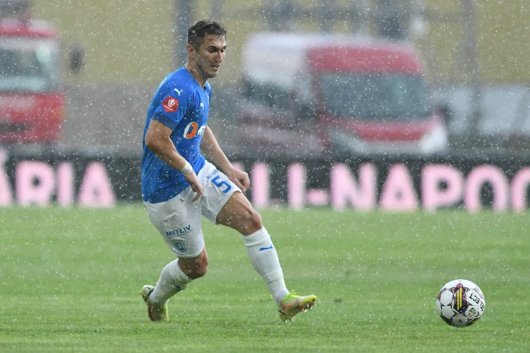 Bogdan Vatajelu (S), de la CS Universitatea Craiova, suteaza in timpul meciului de fotbal contra echipei U Cluj din etapa a II-a a Superligii, disputat pe stadionul Gaz Metan din Medias, duminica, 24 iulie 2022. FLAVIU BUBOI / MEDIAFAX FOTO