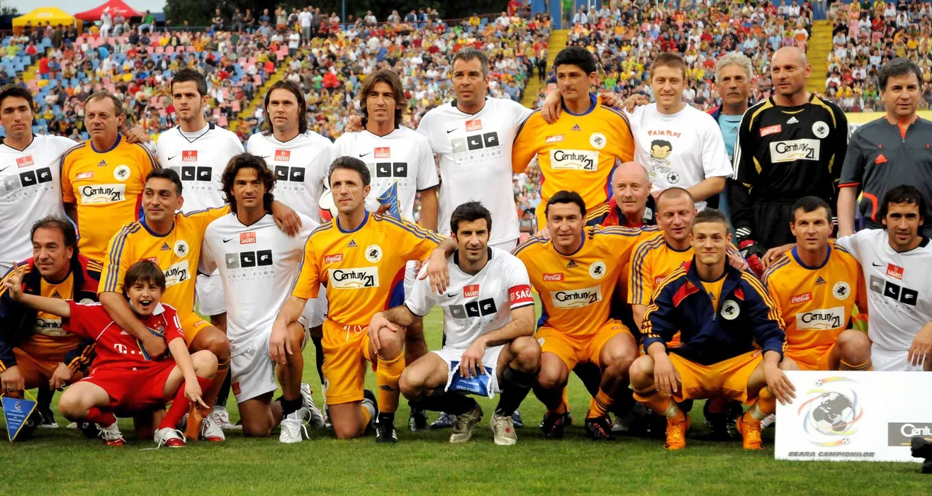 Fotografia de grup dinaintea partidei.Pe randul de sus:Ilie Balaci,Miodrag Belodedici,Vasile Iordache,Bogdan Stelea si Valeriu Argaseala.Pe randul de jos:Marcel Raducanu,Ilie Dumitresu,Fernando Couto,Gica Popescu,Luis Figo,Viorel Moldovan,Dorinel Munteanu,Gabriel Torje,Ovidiu Ioan Sabau si Raul Gonzales.