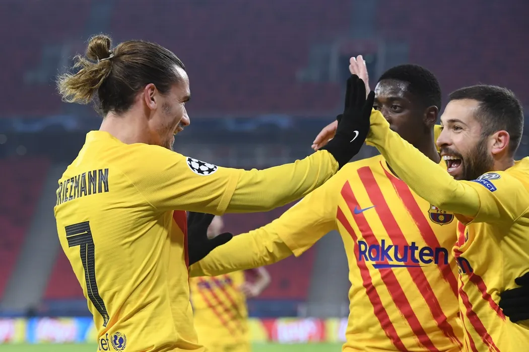 Barcelona's French midfielder Antoine Griezmann (L) celebrates scoring with his team-mates during the UEFA Champions League football match Ferencvaros TC v FC Barcelona in Budapest on December 2, 2020.,Image: 573127004, License: Rights-managed, Restrictions: , Model Release: no