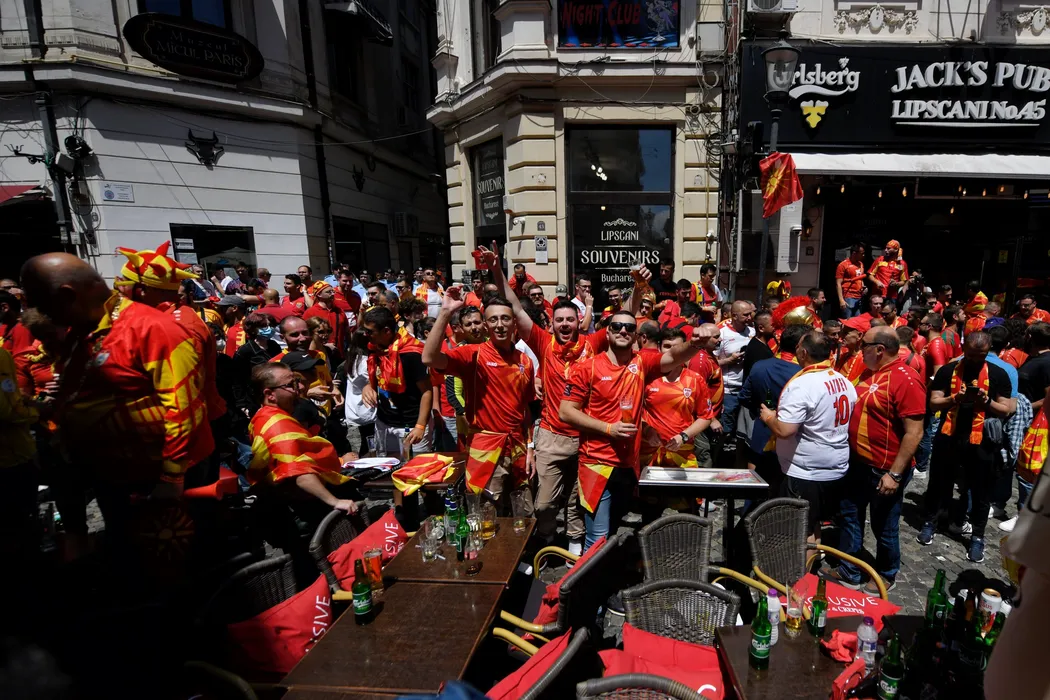 Suporterii reprezentativei de fotbal a Republicii Macedonia de Nord isi manifesta sustinerea pentru favoritii lor, ce vor intalni in cadru turneului final al campionatului european de fotbal EURO-2020, echipa similara a Ucrainei, joi, 17 iunie 2021, in Centrul Vechi din Bucuresti. ANDREEA ALEXANDRU / MEDIAFAX FOTO