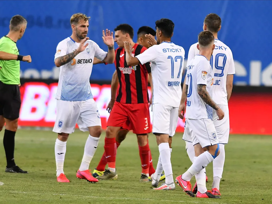 Mihai Balasa il felicita pe Stefan Baiaram dupa meciul de fotbal dintre Universitatea Craiova si Astra Giurgiu, contand pentru play-off-ul Ligii 1 Casa Pariurilor, disputat fara spectatori pe Stadionul Ion Oblemenco din Craiova, vineri 19 iunie 2020. © FOTO:Razvan Pasarica/SPORT PICTURES