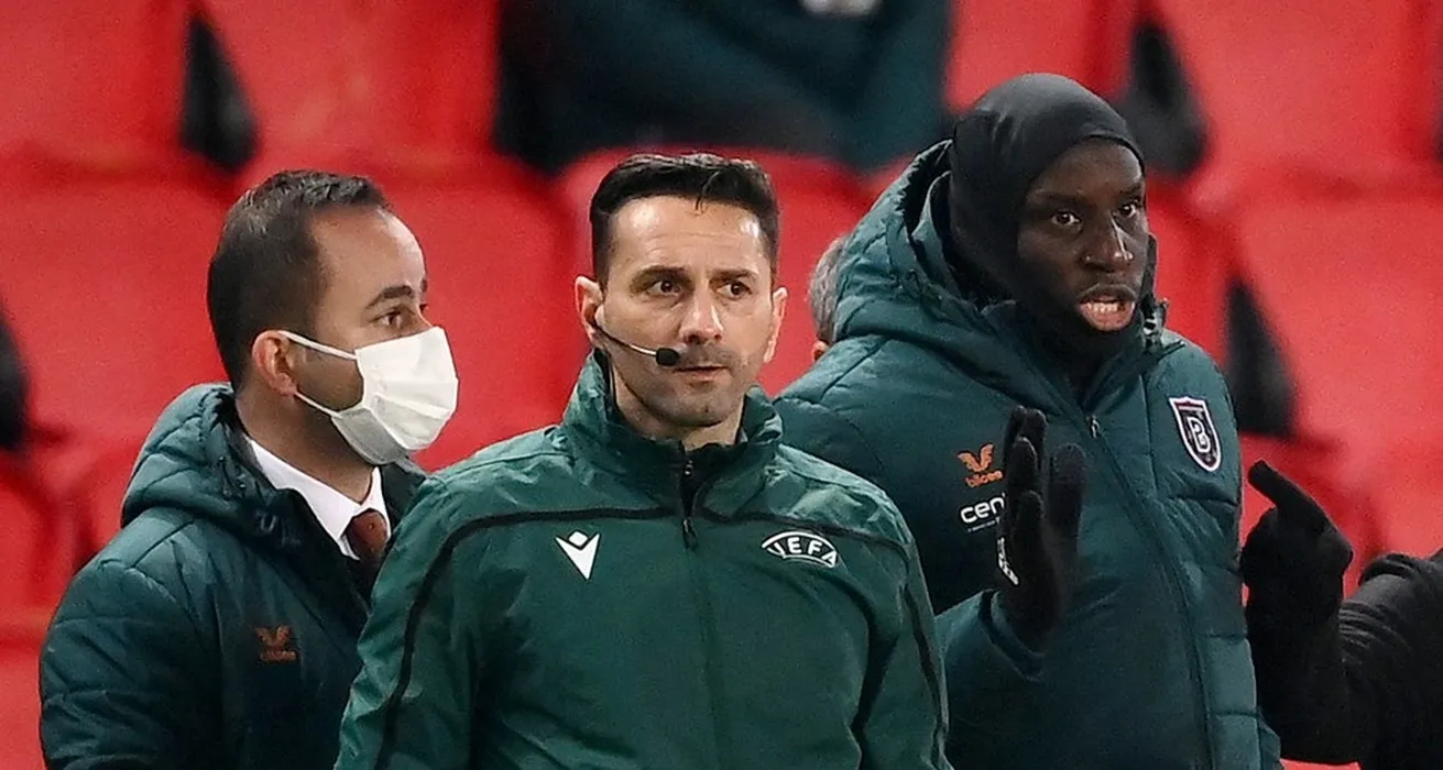 The row erupted after Basaksehir assistant coach Pierre Webo, the former Cameroon international, was shown a red card during a fierce row on the touchline with staff from the Turkish club appearing to accuse the Romanian fourth official of using a racist term.,Image: 574655101, License: Rights-managed, Restrictions: , Model Release: no