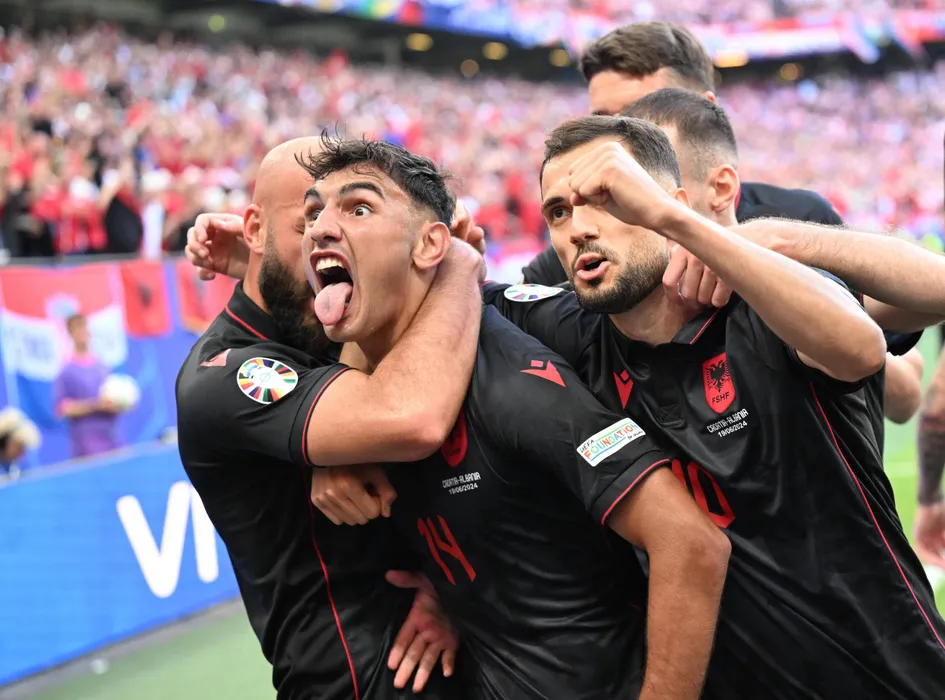 /HEPTA/SPORT PICTURES(240619) -- HAMBURG, June 19, 2024 Photo by Xinhua/ABACAPRESS.COM) -- Qazim Laci (2nd L) of Albania celebrates after scoring during the UEFA Euro 2024 Group B match between Croatia and Albania in Hamburg, Germany on June 19, 2024. Photo by Xinhua/ABACAPRESS.COM/Xiao Yijiu)