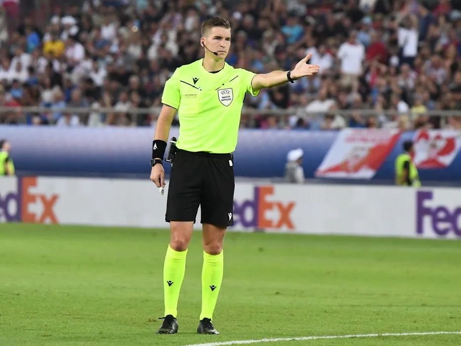 Arbitrul central François Letexier reactioneaza in meciul de fotbal dintre Manchester City FC si Sevilla FC, contand pentru UEFA Europa Conference League, desfasurat pe Stadionul Georgios Karaiskakis din Atena, miercuri 16 august 2023. © FOTO:Tudi/SPORT PICTURES