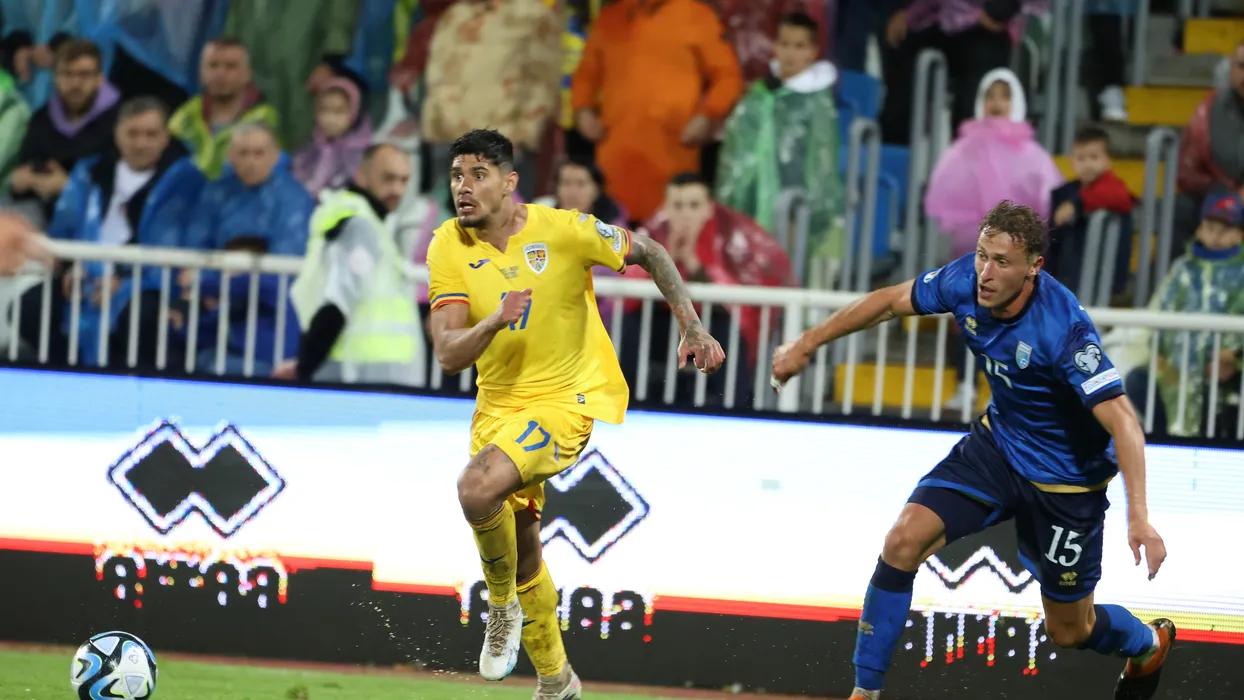 Florinel Coman si Mergim Vojvoda in meciul de fotbal dintre Kosovo si Romania, contand pentru Preliminariile Campionatului European, desfasurat pe Stadionul Fadil Vokrri din Pristina, vineri 16 iunie 2023.© FOTO SPORT PICTURES