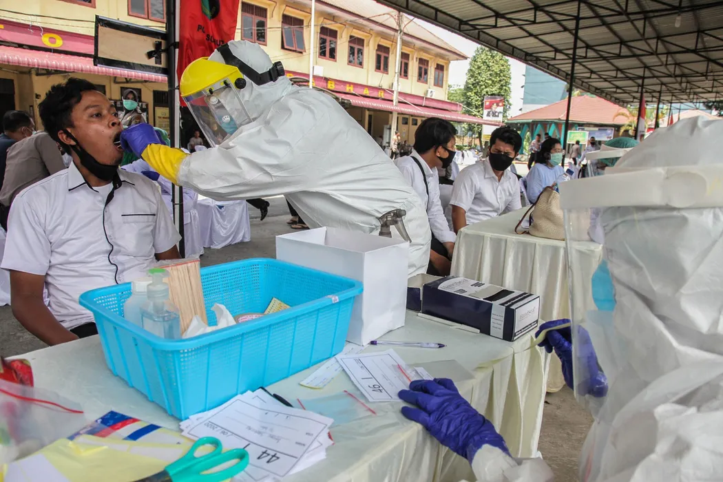 June 25, 2020, Medan, North Sumatra, Indonesia: A healthcare worker wearing protective medical equipment as Indonesian policeman receives a swab test for the COVID-19 amid the outbreak in Medan on June 24, 2020. Indonesia is among those who have begun to reduce large-scale restrictions on what is called the new normal. The worsening economic conditions due to restrictions imposed to overcome the pandemic seem to make the country's leaders feel they have no choice but to take risks to people's health to reduce economic pressure. (Credit Image: © Albert Ivan Damanik/ZUMA Wire)