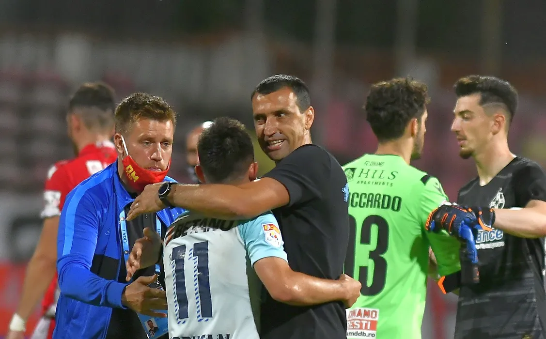 Mihai Pintilii si Bogdan Arges Vintila il felicita pe Olimpiu Morutan dupa meciul de fotbal dintre Dinamo Bucuresti si FCSB, contand pentru turul semifinalei Cupei Romaniei, disputat fara spectatori pe Stadionul Dinamo din Bucuresti, joi 25 iunie 2020. © FOTO:Razvan Pasarica/SPORT PICTURES