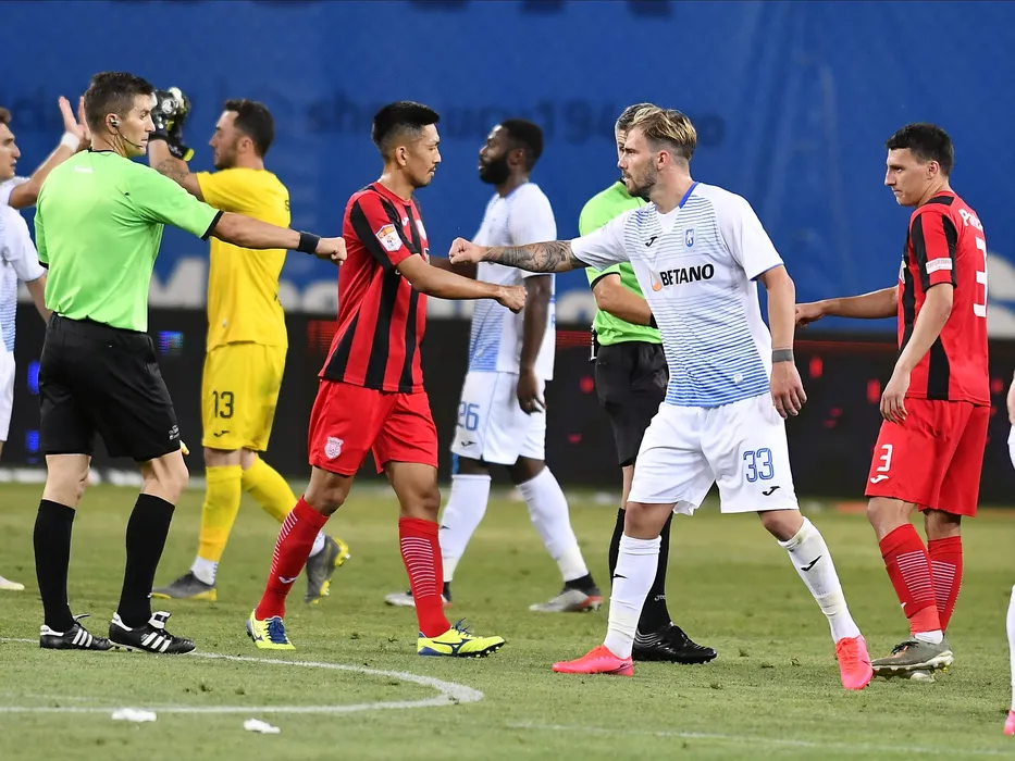 Ciprian Florin Dansa il saluta pe Mihai Balasa sub privirile jucatorilor de la astra Seto Takayuki si Risto Radunovic dupa meciul de fotbal dintre Universitatea Craiova si Astra Giurgiu, contand pentru play-off-ul Ligii 1 Casa Pariurilor, disputat fara spectatori pe Stadionul Ion Oblemenco din Craiova, vineri 19 iunie 2020. © FOTO:Razvan Pasarica/SPORT PICTURES