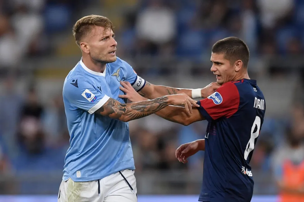 Ciro Immobile of SS Lazio and Razvan Marin of Cagliari Calcio during the Serie A football match between SS Lazio and Cagliari Calcio at Olimpico stadium in Rome (Italy), September 19th, 2021. Photo Antonietta Baldassarre / Insidefoto/Sipa USA,Image: 632879522, License: Rights-managed, Restrictions: *** World Rights Except Germany, Italy, Japan, and The Netherlands ***, Model Release: no, Credit line: Profimedia