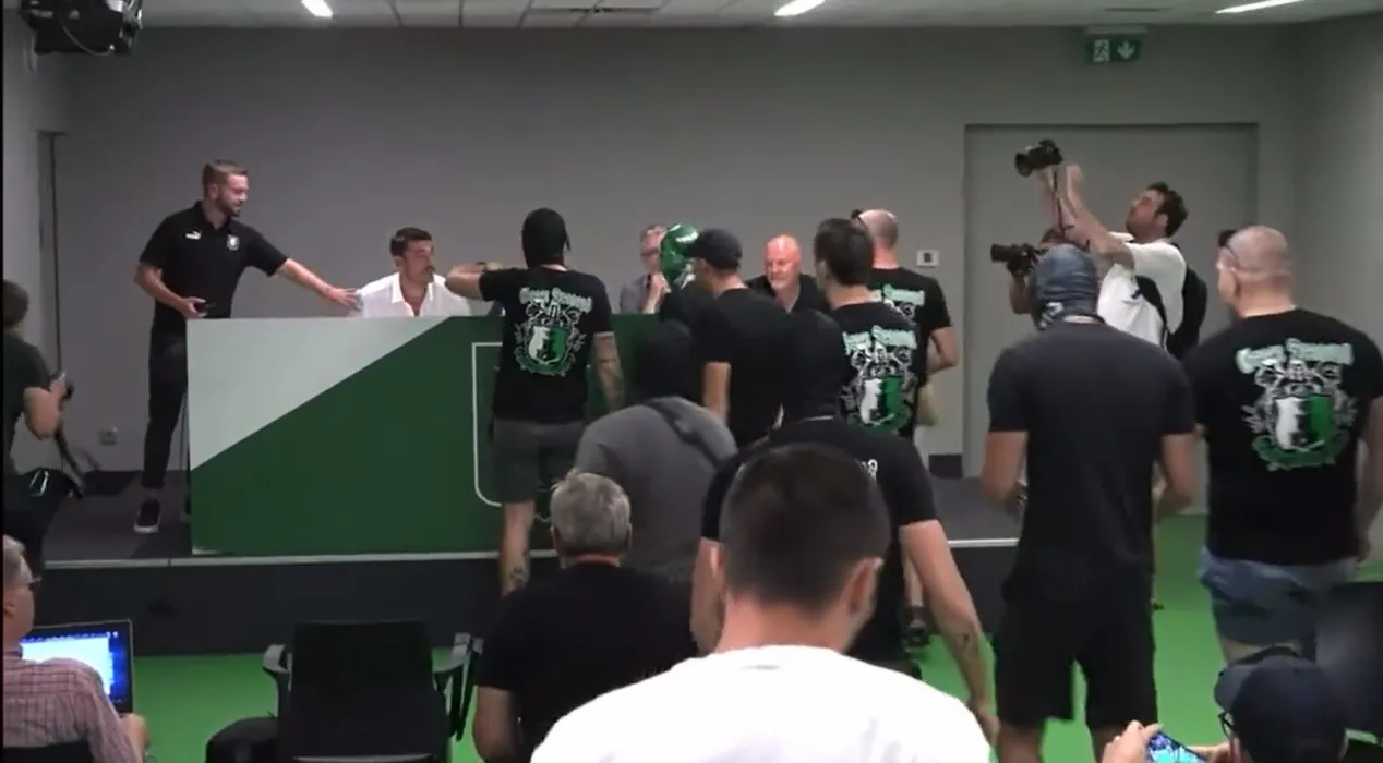 Constantin Valentin Budescu este salutat de catre George Cristian Merloi la antrenamentul oficial de dinaintea finalei Cupei Romaniei ce o vor disputa impotriva celor de la Sepsi OSK Sfantu Gheorghe, desfasurat la Stadionul Rapid din Bucuresti, miercuri 18 mai 2022. © FOTO:Razvan Pasarica/SPORT PICTURES