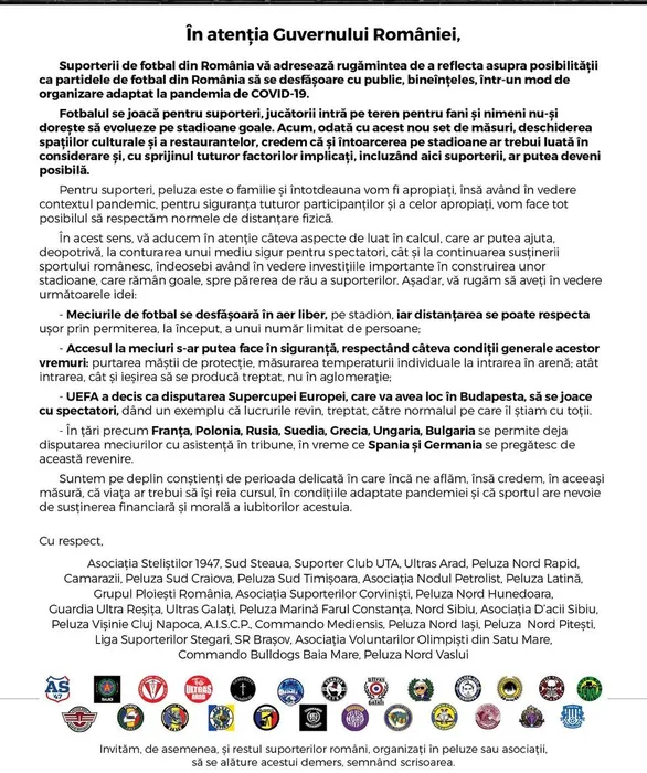 Ultrașii din România vor să se întoarcă pe stadioane! Scrisoare specială pentru Guvernul României: „Pentru suporteri, peluza este o familie!”