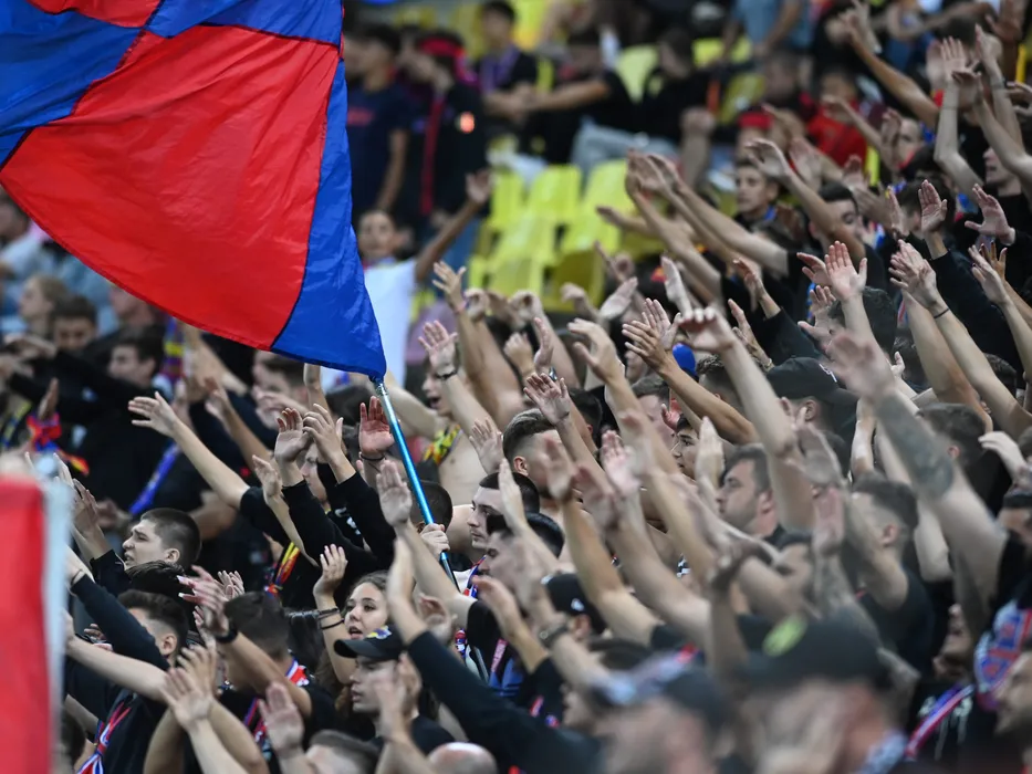 Suporterii stelisti cu un steag ros albastru in peluza la meciul de fotbal dintre FCSB si FC Voluntari, contand pentru Superliga Superbet, desfasurat pe Arena Nationala din Bucuresti, luni 12 septembrie 2022. © FOTO:Razvan Pasarica/SPORT PICTURES
