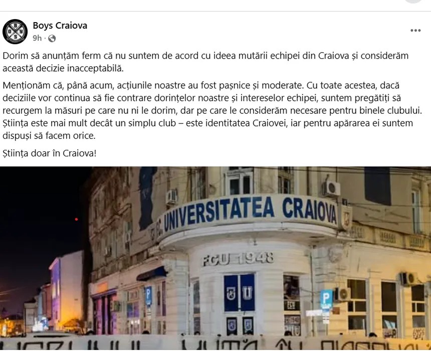 Ultrașii lui FCU 1948, mesaje în miez de noapte pentru Adrian Mititelu și Lia Olguta Vasilescu: „Lăsați deoparte piedicile și interesele ascunse, Știința trebuie să joace în Craiova fără taxe interpuse!”. SPECIAL