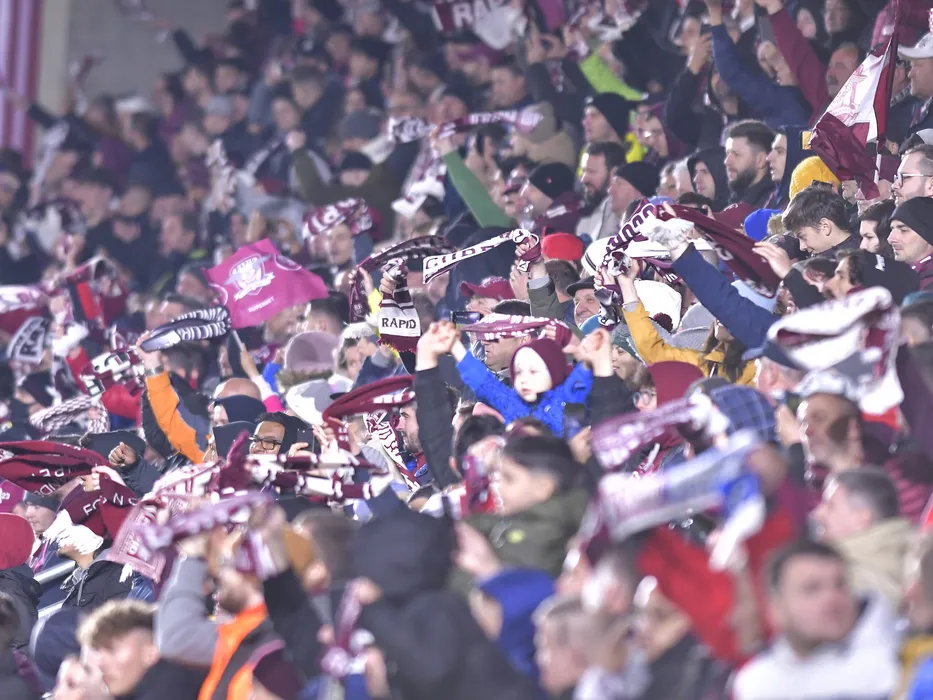 Suporterii rapidisti se bucura cu esarfele visinii la meciul de fotbal dintre Rapid Bucuresti si Gaz Metan Medias, contand pentru Play out-ul Ligii 1 Casa Pariurilor, desfasurat pe Stadionul Rapid-Giulesti din Bucuresti, luni 18 aprilie 2022. © FOTO:Razvan Pasarica/SPORT PICTURES