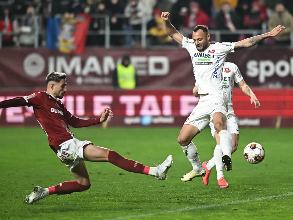 Albion Rrahmani marcheaza un gol de langa Florin Bejan in meciul de fotbal dintre Rapid Bucuresti si FC Hermanstadt, din cadrul Superligii Superbet, desfasurat pe Superbet Arena-Giulesti din Bucuresti, vineri 16 februarie 2024. © FOTO:Razvan Pasarica/SPORT PICTURES