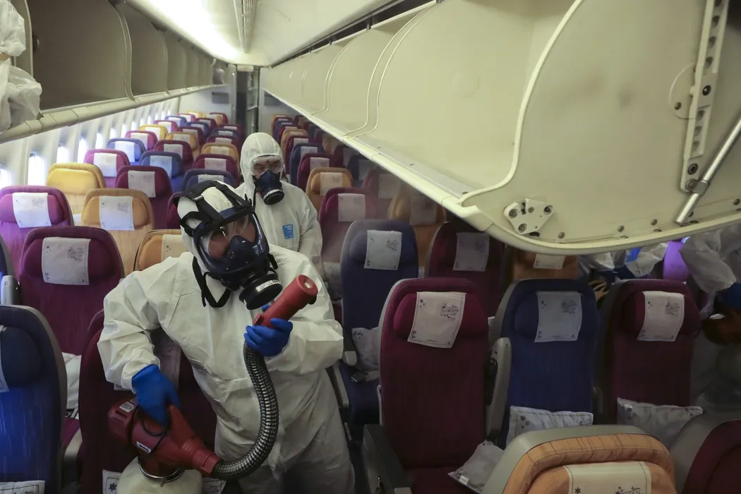 January 28, 2020, Samut Prakan, Thailand: Crew members in protective suits and masks spraying during the disinfection process..Thai Airways International spray disinfectant on passenger seats all plane following a risky corona virus infection. Thailand has detected 14 cases, Thai health officials are stepping up monitoring and inspection. The virus has so far killed at least 106 people an outbreak which began in the Chinese city of Wuhan., Image: 495264830, License: Rights-managed, Restrictions: , Model Release: no, Credit line: Patipat Janthong / Zuma Press / Profimedia