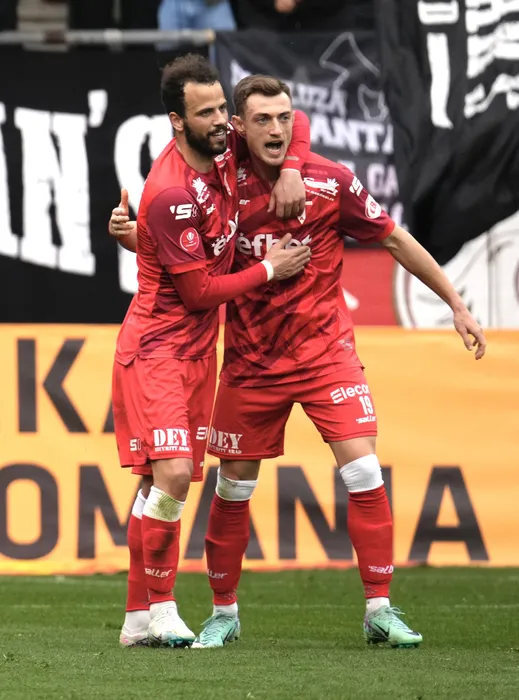 Claudiu Valentin Micovschi felicitat de Joao Pedro Almeida Machado după un gol marcat în meciul de fotbal dintre UTA Arad si FCU 1948 Craiova, contând pentru Superliga Superbet, desfășurat pe Arena Francisc Neuman din Arad, sâmbătă 2 martie 2024. © FOTO: Alexandra FECHETE/SPORT PICTURES