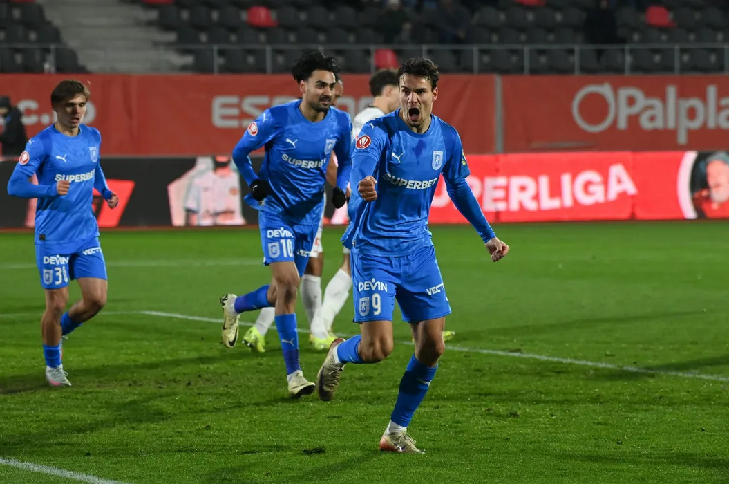 Assad Al Islam Al Hamlawi se bucura dupa un gol marcat in meciul de fotbal dintre AFC Hermannstadt Sibiu si Universitatea Craiova, contand pentru Superliga Superbet, desfasurat pe Stadionul Municipal din Sibiu, duminica 14 decembrie 2025. © FOTO:Alex Veres/SPORT PICTURES