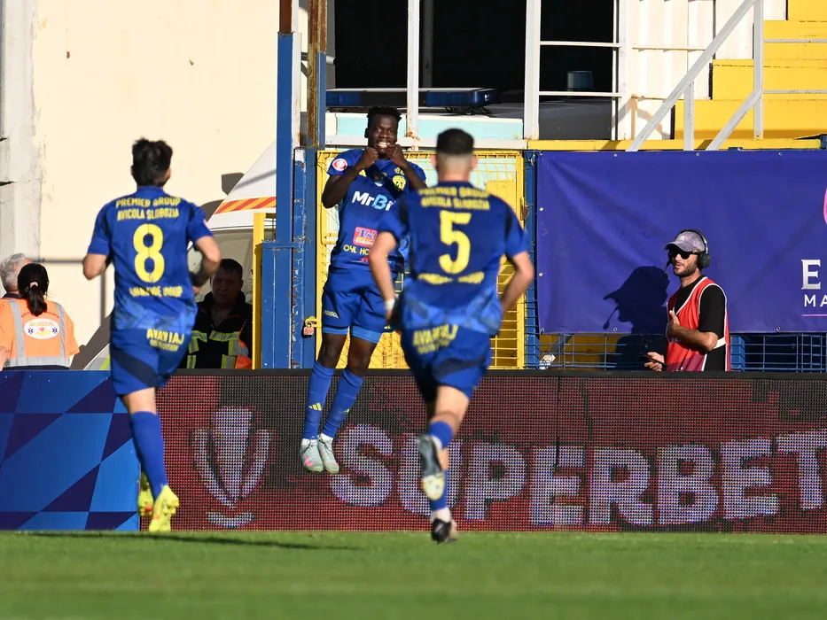 Nkama Christ Afalna se bucura dupa un gol marcat in meciul dintre Unirea Slobozia si Petrolul Ploiesti, contand pentru Superliga Superbet, desfasurat pe Clinceni Arena din Clinceni, duminica 21 septembrie 2025. © FOTO:Razvan Pasarica/SPORT PICTURES
