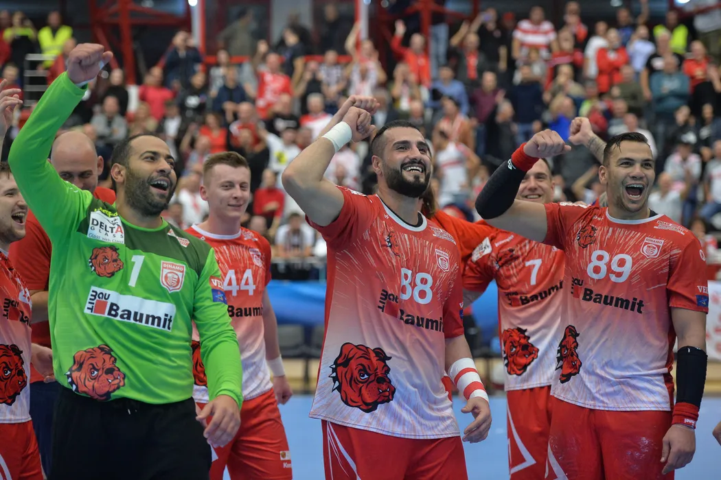 Formatia Dinamo (echipament rosu-alb) joaca impotriva echipei Chekhovskye Medvedi din Rusia, in cadrul penultimei etape a grupei D a Ligii Campionilor la handbal masculin, miercuri, 20 noiembrie, in Bucuresti. ALEXANDRU DOBRE / MEDIAFAX FOTO