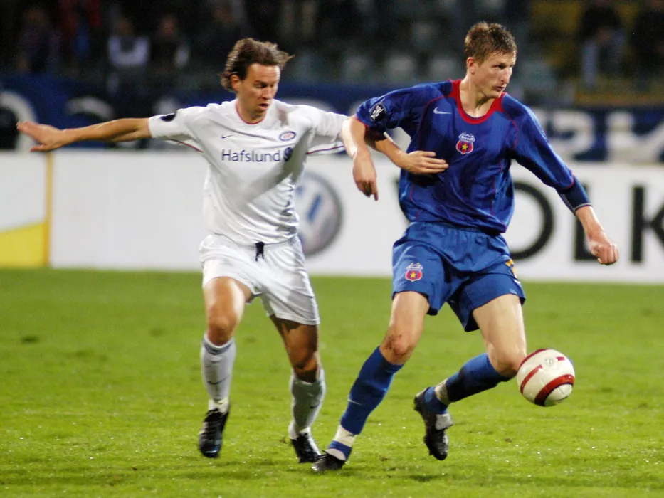 Morten Berre si Dorin Goian in meciul de fotbal dintre Steaua Bucuresti si Valerenga FC, contand pentru Cupa UEFA, disputat pe Stadionul Gheorghe Hagi din Constanta, joi 29 septembrie 2005. © FOTO:Razvan Pasarica/SPORT PICTURES