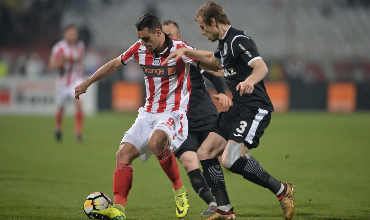 Ivan Pesic (S), de la Dinamo Bucuresti, lupta pentru balon cu Cristian Sarghi (D), de la Gaz Metan Medias, in timpul meciului de fotbal din prima etapa a play-out-ului Ligii 1, disputat pe stadionul Stefan cel Mare din Bucuresti, luni, 12 martie 2018. ALEXANDRU DOBRE / MEDIAFAX FOTO