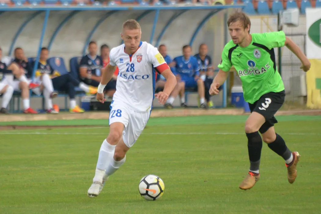 Mihai Roman (S), de la FC Botosni lupta pentru balon cu Cristin Sarghi (D), de la Gaz Metan Medias, in timpul meciului de fotbal din etapa a XIV-a a play-out-ului Ligii 1, disputat pe stadionul Municipal din Botosani, sambata, 2 iunie 2018. IONUT TABULTOC / MEDIAFAX FOTO