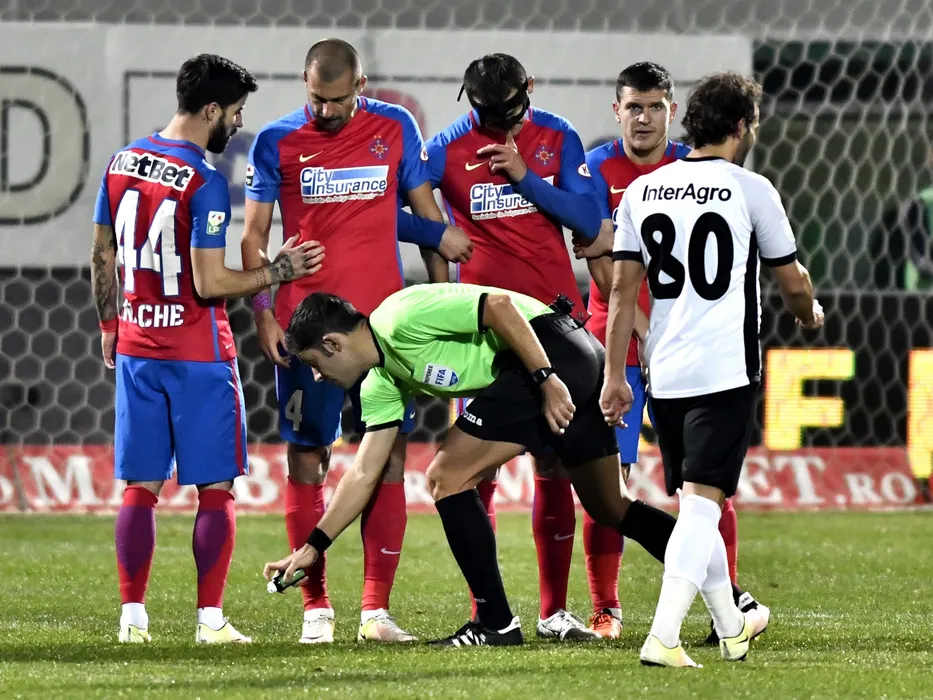 Arbitrul central Radu Petrescu alaturi de zidul Stelei format din Gabriel Enache,Gabriel Tamas,Bojan Golubovic si Alexandru Bourceanu