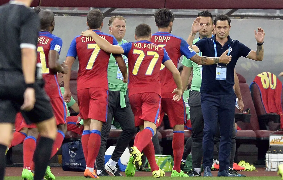 Massimo Pedrazzini si Mirel Radoi se bucura alaturi de fotbalistii stelisti la golul lui Adrian Popa