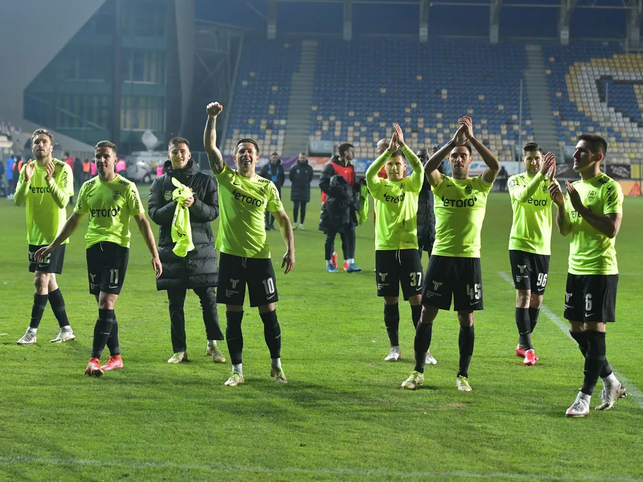 Fotbalistii clujeni Gabriel Debeljuh, Alexandru Mihaita Chipciu, Ciprian Ioan Deac, Mihai Catalin Bordeianu, Mario Camora, Constantin Adrian Paun si Daniel Graovac saluta galeria dupa meciul de fotbal dintre Chindia Targoviste si CFR Cluj, contand pentru Liga 1 Casa Pariurilor, desfasurat pe Stadionul Ilie Oana din Ploiesti, sambata 4 decembrie 2021. © FOTO:Razvan Pasarica/SPORT PICTURES
