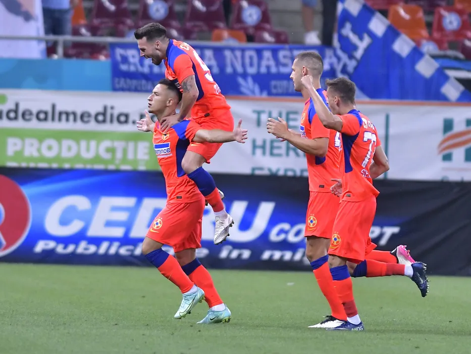 Bucurie a fotbalistilor stelisti dupa un gol marcat cu Olimpiu Vasile Morutan, Andrei Ioan Cordea si Stipe Vucur in meciul de fotbal dintre FCSB si Universitatea Craiova, contand pentru Liga 1 Casa Pariurilor, desfasurat pe Arena Nationala din Bucuresti, duminica 25 iulie 2021. © FOTO:Razvan Pasarica/SPORT PICTURES