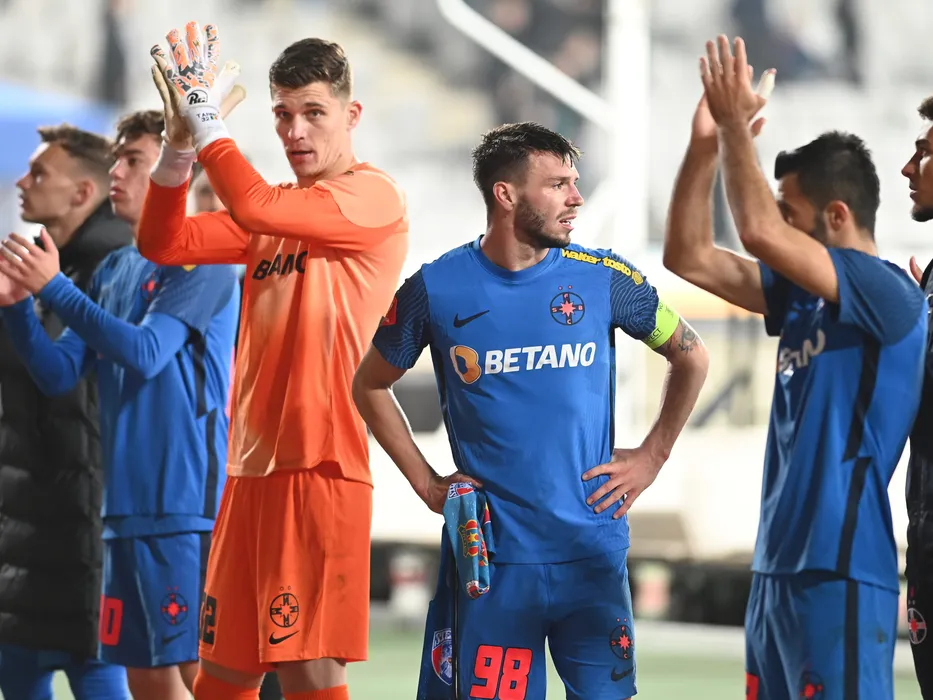 Fotbalistii stelisti Stefan Tarnovanu si Andrei Ioan Cordea saluta galeria dupa meciul de fotbal dintre Universitatea Cluj si FCSB, contand pentru Superliga Superbet, desfasurat pe Cluj Arena din Cluj Napoca, duminica 31 octombrie 2022. © FOTO:Razvan Pasarica/SPORT PICTURES