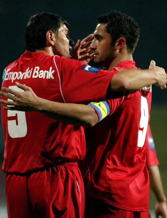 Cosmin Pascovici (in stanga) il felicita pe Claudiu Niculescu pentru golul marcat.