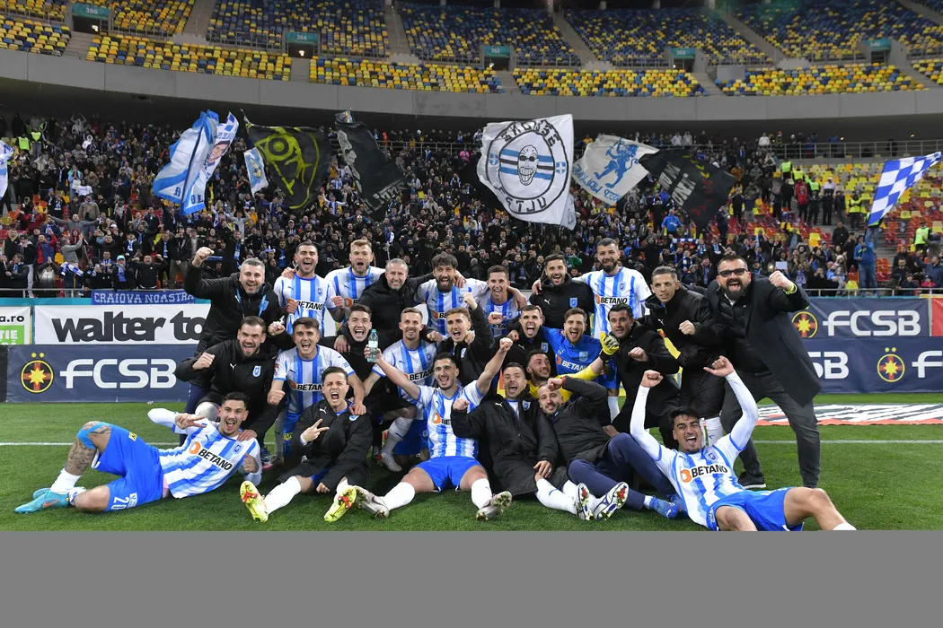 Fotbalistii craioveni alaturi de staff si suporteri la o fotografie de grup realizata dupa victoria din meciul de fotbal dintre FCSB si Universitatea Craiova, contand pentru Play-off-ul Ligii 1 Casa Pariurilor, desfasurat pe Arena Nationala din Bucuresti, duminica 3 aprilie 2022. © FOTO:Razvan Pasarica/SPORT PICTURES