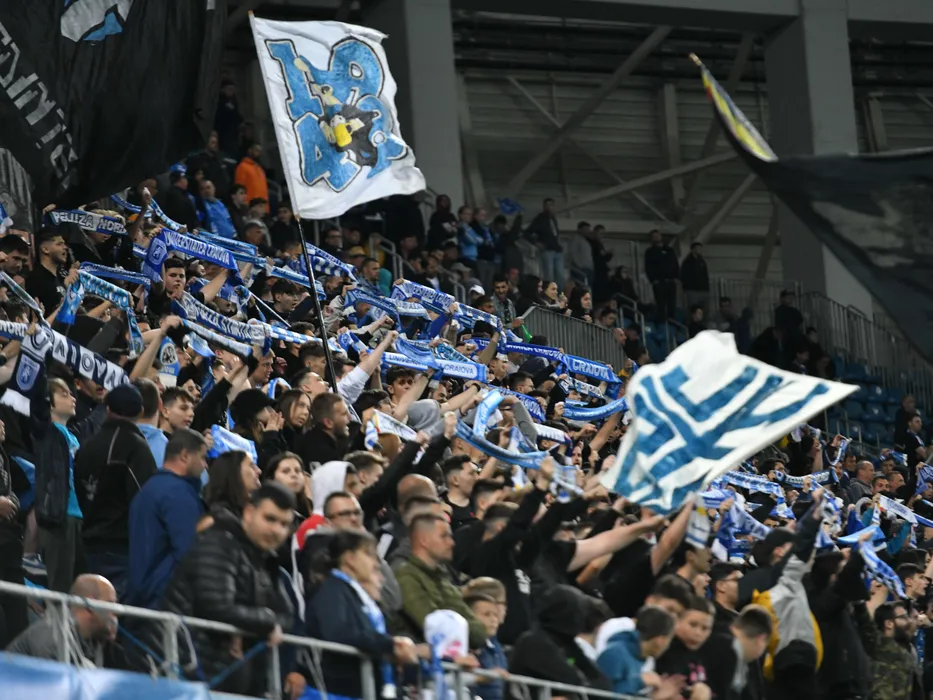 Suporterii craioveni cu fulare si steaguri in peluza isi incurajeaza favoritii la meciul de fotbal dintre Universitatea Craiova si FC Voluntari, contand pentru Play-off-ul Ligii 1 Casa Pariurilor, desfasurat pe Stadionul Ion Oblemenco din Craiova, sambata 30 aprilie 2022. © FOTO:Razvan Pasarica/SPORT PICTURES
