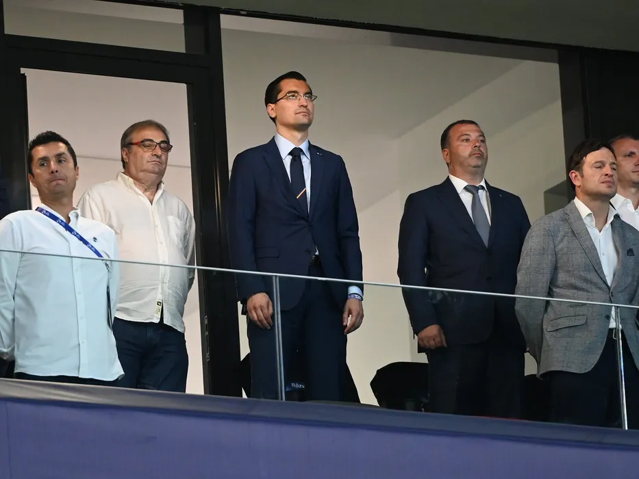 Mihai Stoichita si Razvan Burleanu in tribuna la meciul de fotbal dintre Spania U21 si Croatia U21, contand pentru Campionatul European U21, desfasurat pe Stadionul Steaua din Bucuresti, miercuri 5 iulie 2023.,Image: 787376238, License: Rights-managed, Restrictions: , Model Release: no
