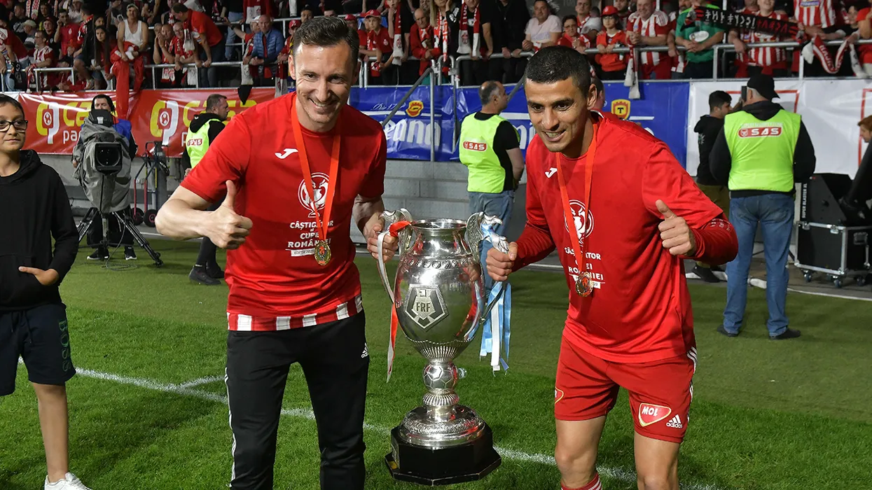 Razvan Tincu si Gabriel Cristian Vasvari pozeaza alaturi de trofeu dupa meciul de fotbal dintre Sepsi OSK Sfantu Gheorghe si FC Voluntari, finala Cupei Romaniei, desfasurat pe Stadionul Rapid din Bucuresti, joi 19 mai 2022. © FOTO:Razvan Pasarica/SPORT PICTURES