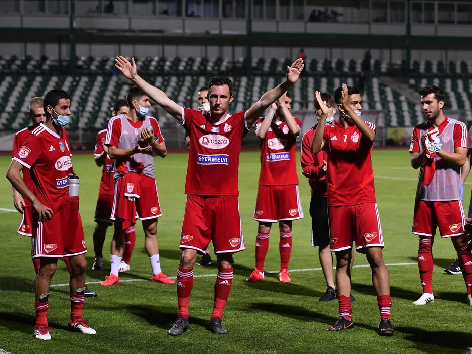 Fotbalistii de la Sepsi Gabriel Cristian Vasvari, Razvan Tincu si George Ionut Dragomir isi saluta suporterii dupa meciul de fotbal dintre Sepsi OSK si FC Viitorul, contand pentru play-out-ul Ligii 1 Casa Pariurilor, disputat fara spectatori pe stadionul Municipal din Sfantu Gheorghe, sambata 27 iunie 2020.